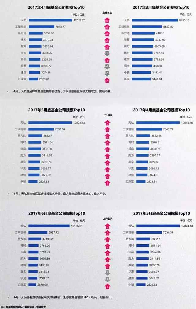 从第二季度三个月的基金公司规模排名,可以预见的是,随着行业竞争的白热化,我国公募第一阵营座次轮换更加快。慧科监测显示,截至今年6月末, 规模排在前十的基金公司依次是天弘、工银瑞信、易方达、博时、招商、南方、建信、嘉实、华夏以及汇添富,这份名单与十年前(2007年末)相比已经大相径庭,彼时还在名单上的广发、大成、银华、华安、富国如今已经被“踢”出在十名之外;而即便与两年前(2015年末)相比,上榜的基金公司也有一定变化。