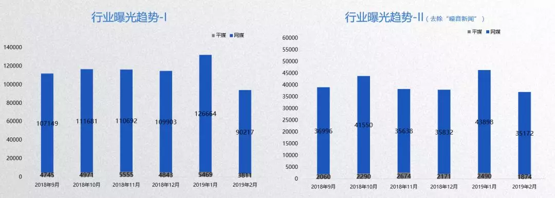 2019年2月,行业总体新闻量随之环比下降28.8%,去除 “噪音新闻”之后的行业整体新闻量环比下降20.1%,行业整体推广类新闻量环比下降9.8%,敏感新闻量环比下降51.6%,负面新闻大幅回落。