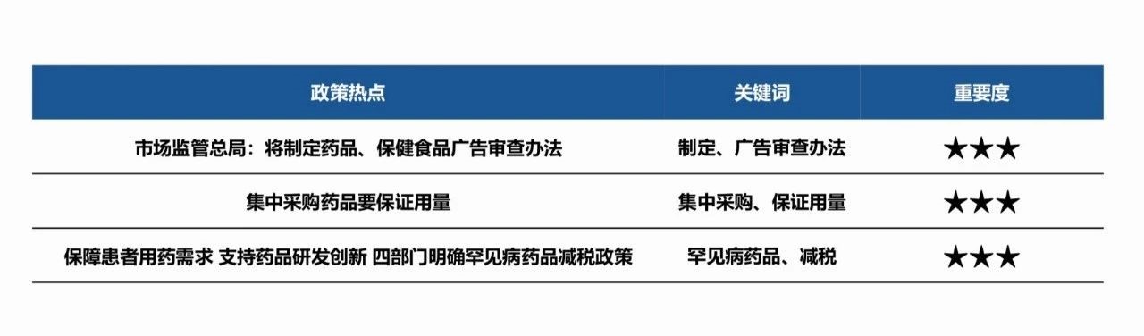 本月政策热点集中在“广告监察”、“药品集中采购”、“药品减税”等。具体如下: