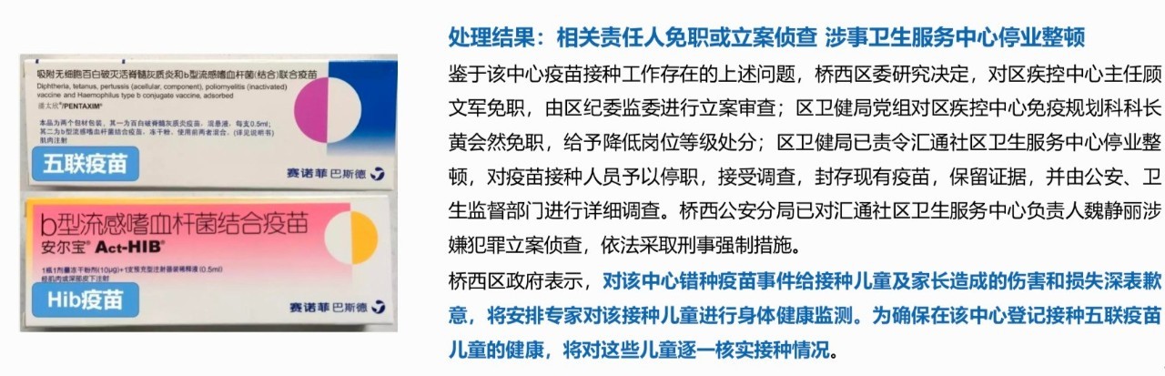 2月疫苗再现负面,河北省石家庄市汇通社区卫生院使用廉价的单联疫苗代替五联疫苗,目前相关责任人已被免职或立案侦查,涉事卫生服务中心停业整顿。
