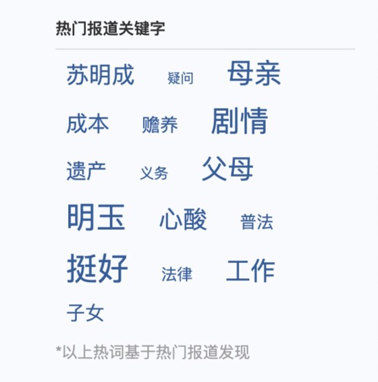 不到一个月的播出期,《都挺好》承包微博热搜近百次,“苏明成”、“苏明玉”、“苏大强”成为早春最热话题,这也与慧科讯业抓取到的热门报道关键字结果高度吻合。“都挺好”的热门报道中,“明玉”、“苏明成”、“剧情”、“母亲”高频出现。