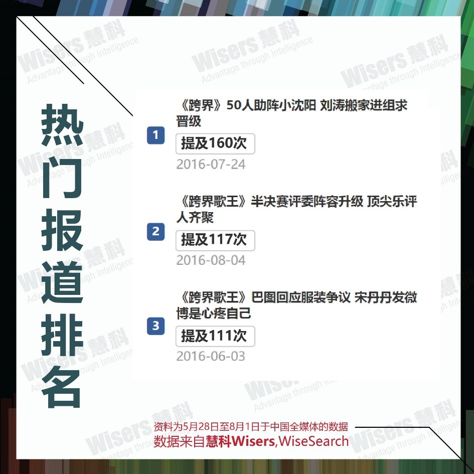 【摘要】本期慧科讯业AI大数据媒体监测时间,慧科小编继续为大家送上中国热门综艺大数据!至于为什么要说《跨界歌王》,因为小编觉得《跨界歌王》是中国本土原创类综艺的一个创新和华丽的转型,专门找了观众并不确定他们唱歌是否好听的演员来挑战这个“可能性”,让演员与歌手的迥异身份进行互调,上演了一出穿越的魔力。这种充满新鲜感的化学反应足以让观众心醉神迷,重新定义了音乐节目的呈现方式。