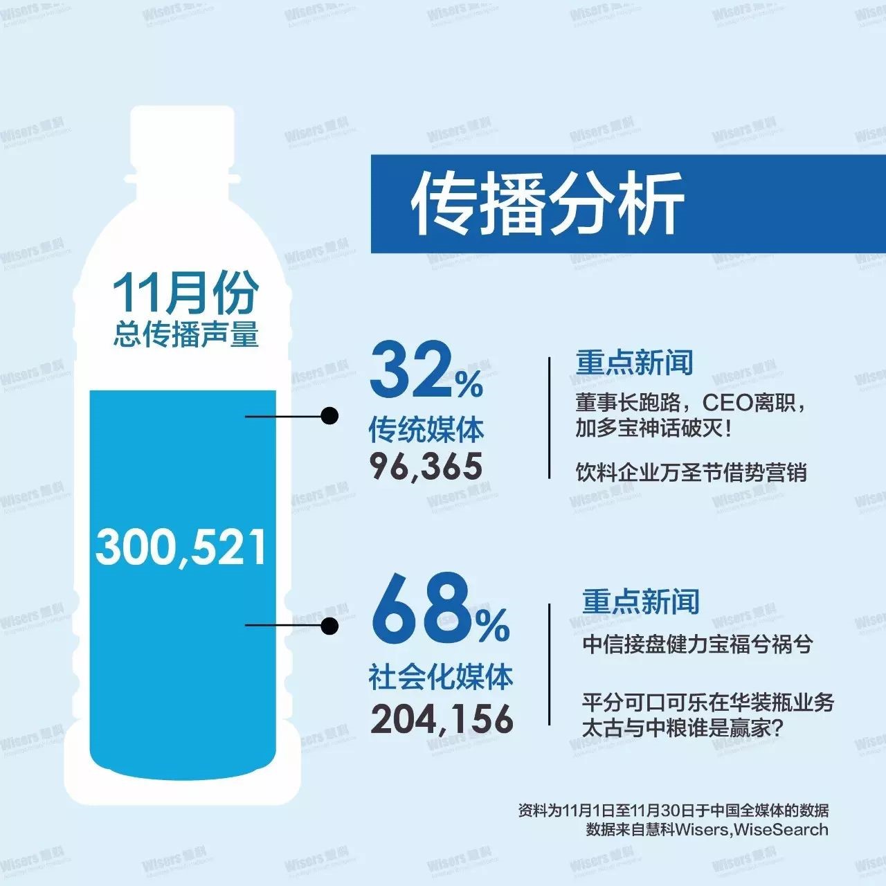 慧科《2016年11月份饮料行业传播分析报告》最近出炉,各传播榜单也随之产生。报告显示,11月共监测饮料行业传播声量300521篇,其中传统媒体96365篇,占比32%,社会化媒体204156篇,占比68%。从传播趋势看,11月饮料行业的传播高峰在29日,共监测到14780篇报道。传统媒体的传播峰值亦出现在27日,主要传播话题分别为“中信接盘健力宝福兮祸兮”等。社交媒体的传播峰值则出现在1日,主要传播话题分别为“董事长跑路,CEO离职,加多宝神话破灭!”。