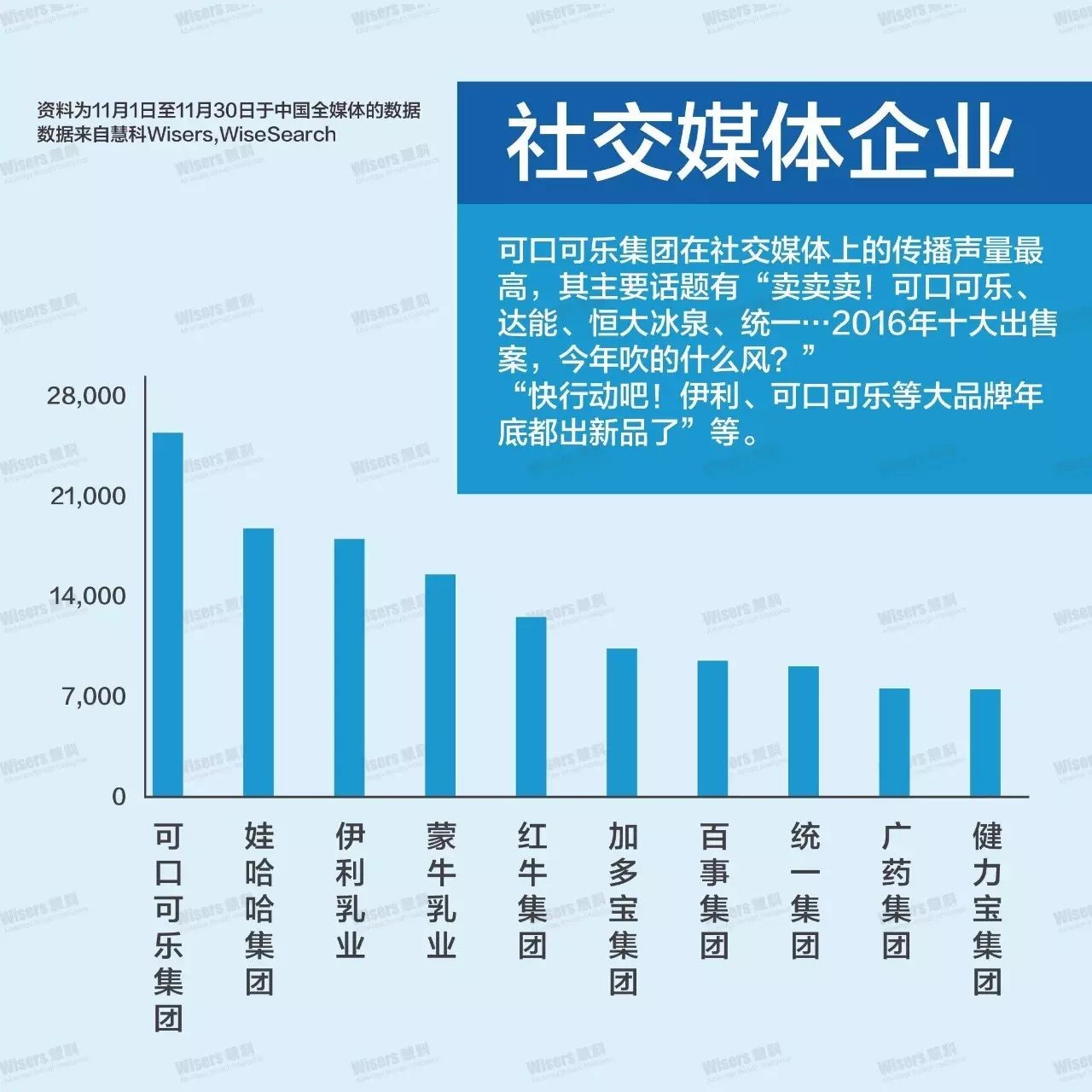 由于“卖卖卖!可口可乐、达能、恒大冰泉、统一…2016年十大出售案,今年吹的什么风?”“快行动吧!伊利、可口可乐等大品牌年底都出新品了”“可口可乐‘甩手’中国瓶装业务两大碳酸饮料巨头变相‘减码’中国市场”等话题的大量传播,可口可乐集团的用户分享量急速提升,口碑指数位列第一。