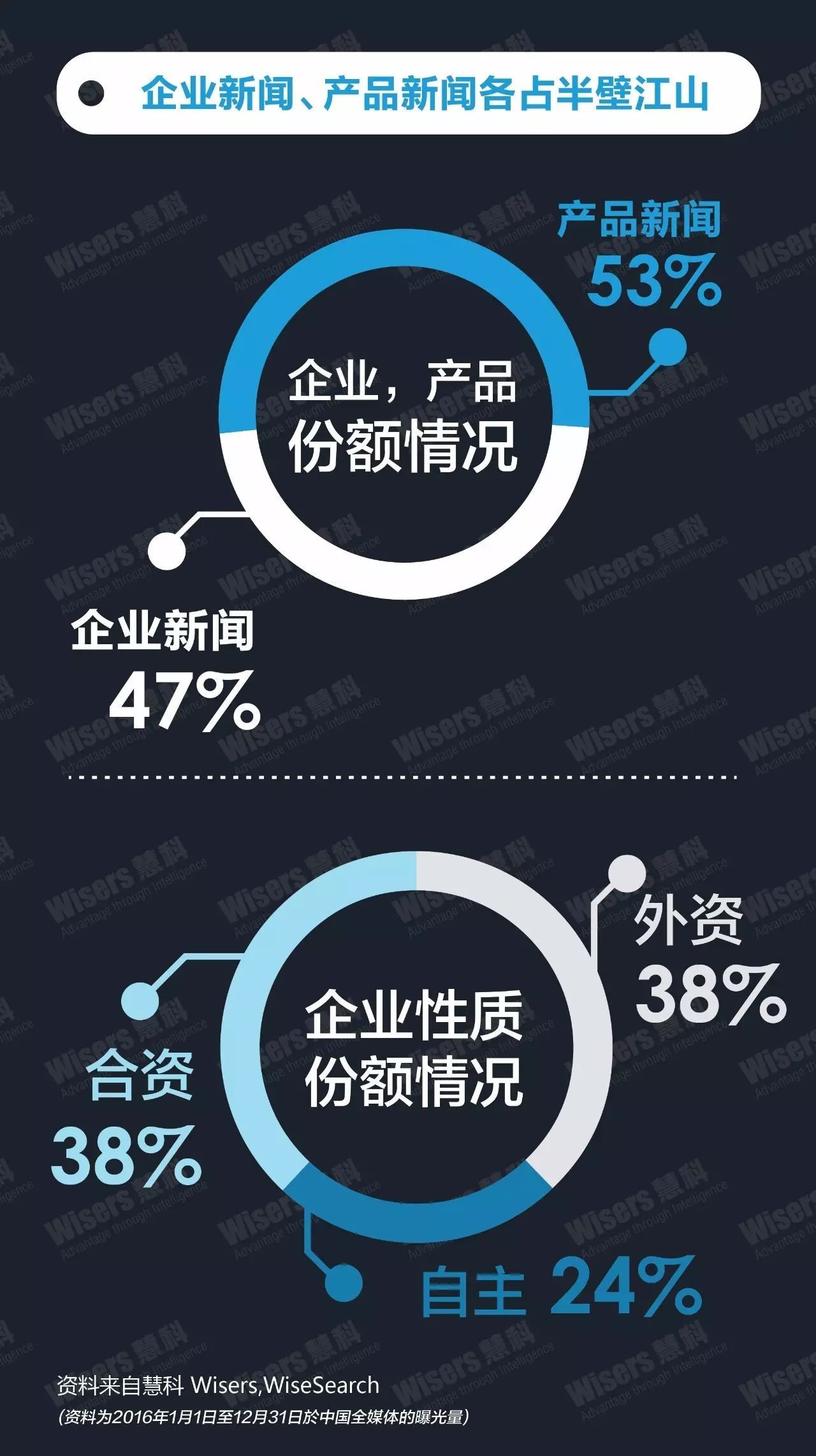 从慧科全媒体大数据平台监测到2016年产品类新闻占比53%,主要为优惠促销、新品新闻等;企业层面新闻则占比47%,以新品信息、销量业绩等内容为主。从企业性质来看,合资、外资均占比38%,自主传播较弱,占比仅为24%,主要是由于合资、外资车企产品类型较多,产品线丰富,发布新闻声量较高。