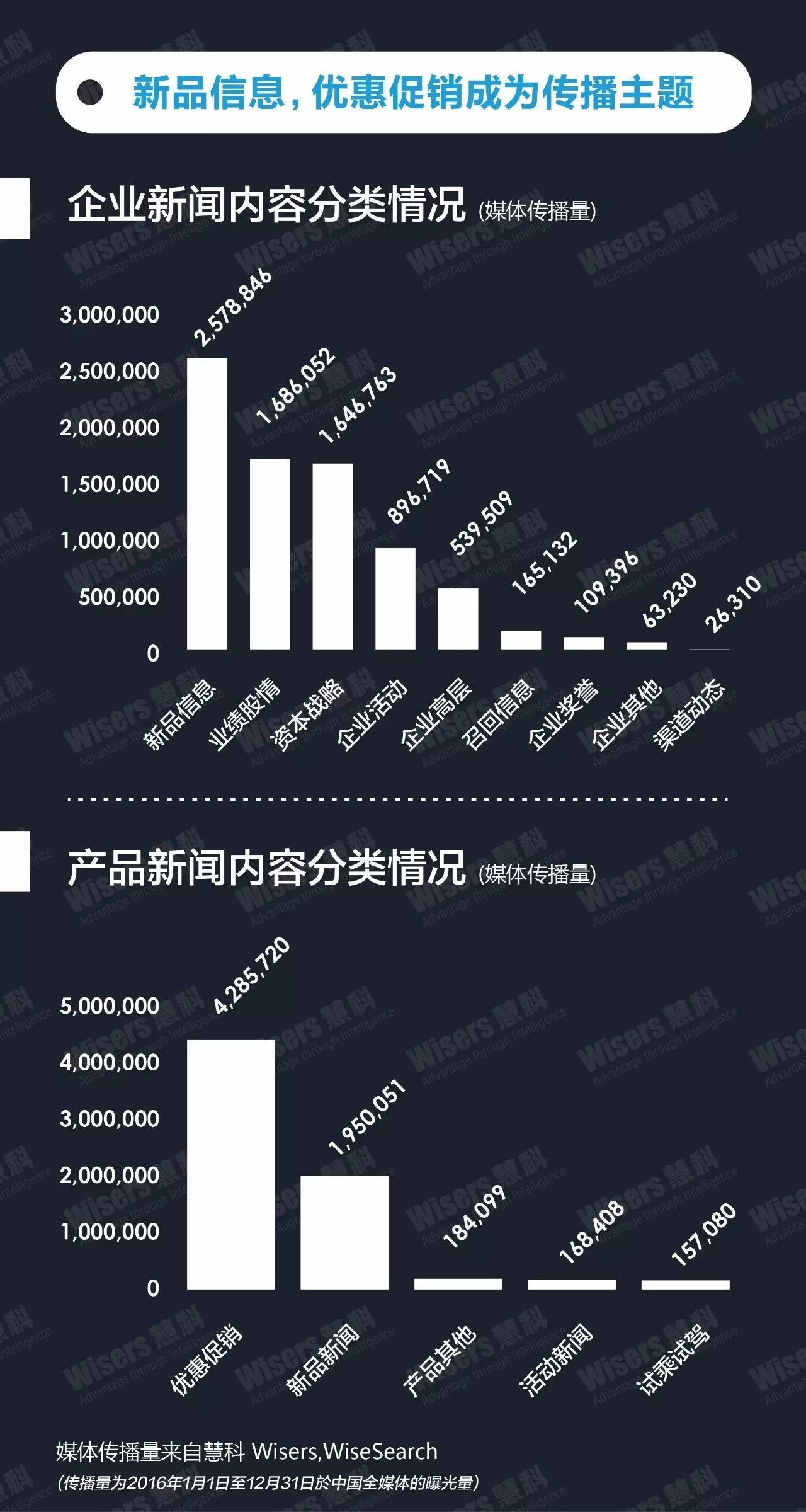 从企业层面新闻内容分类来看,新品信息、业绩股情、资本战略新闻传播量较高,均超百万篇,主要是关于投资战略、企业合作、2016年销量业绩等相关内容。从产品新闻内容分类来看,优惠促销成为本年度首要传播主题,传播量超400万篇;其次为新品新闻,传播量近200万篇;再次为产品其他、活动新闻、试乘试驾等,更有针对性的吸引消费者,以促进销量目标的达成。