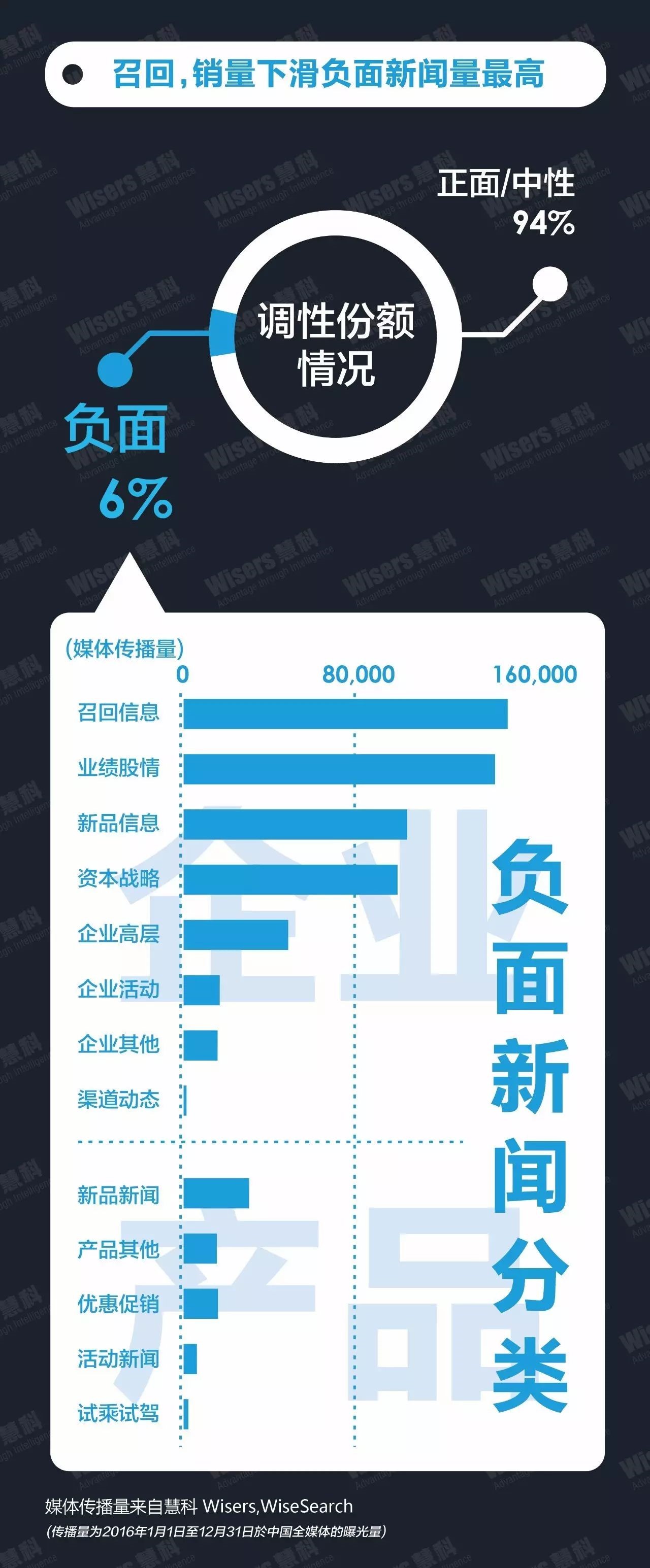 在2016年度新闻传播中,负面新闻占比约为6%,主要负面事件为“德国大众排放门赔偿方案出炉将花162亿欧元善后”“奇瑞受累奇瑞万达骗补事件新能源战略商务车双受挫”“特斯拉在华发生首起自动驾驶事故”“上汽通用汽车价格垄断被罚2.01亿”等。另外,从慧科全媒体大数据平台监测到企业敏感新闻传播量明显高于产品敏感新闻,企业负面主要集中在召回、业绩销量下滑等方面,产品负面主要集中在消费者对产品质量投诉、用户使用抱怨等方面。