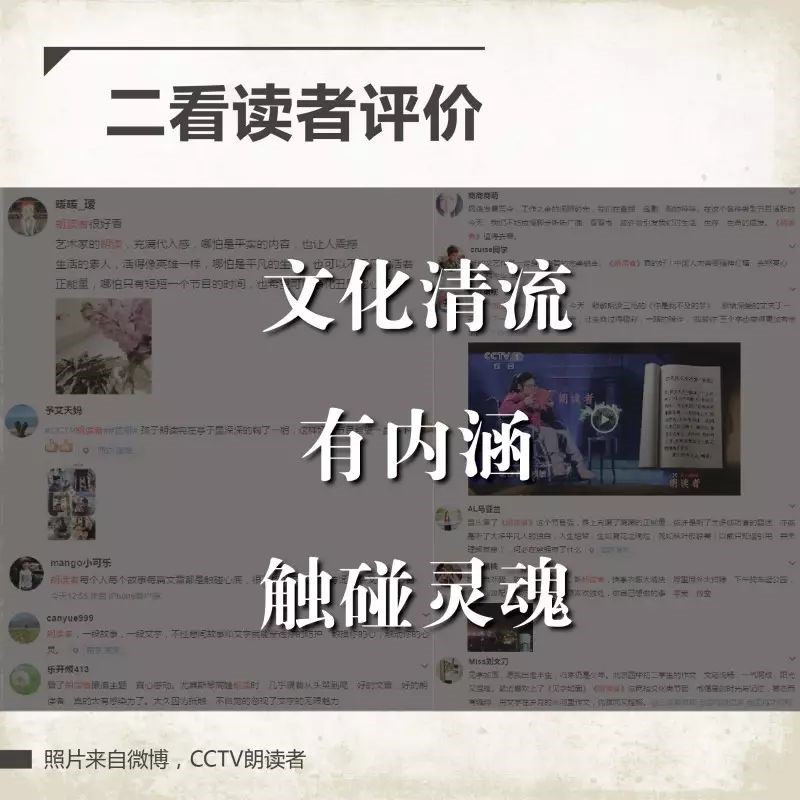《朗读者》的走红也在于它诉诸于文化与情感的模式,迎合了大众追求纯净、美好、真诚、朴素的文化精神需求。节目播出后,网友好评如潮,并唤起民众对读书的热情。“有内涵”,“文化清流”、”触碰灵魂”这些评语彰显了这档节目的深度。