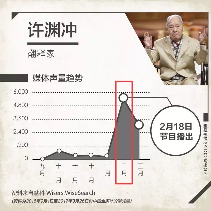 一部好的电影会捧红一些演员, 一档优秀的节目也会让嘉宾更加出彩。 《朗读者》的嘉宾覆盖各个领域,有演员,有企业家,有学者,有医生,有普通人,他们用自己独特的人生经历假以声音和文字,为观众带来灵魂的盛宴。通过节目,他们也获得大众的关注和认可。节目首期,96岁翻译家许渊冲老先生,在谈论自己热爱的翻译事业时,依旧滔滔不绝,说到动情时刻依旧是热泪盈眶,每一个眼神中都流淌出智慧的光辉。节目播出后(2月18日)许老先生受到大众和媒体的关注,媒体声量直线攀升。(近六个月媒体声量对比)