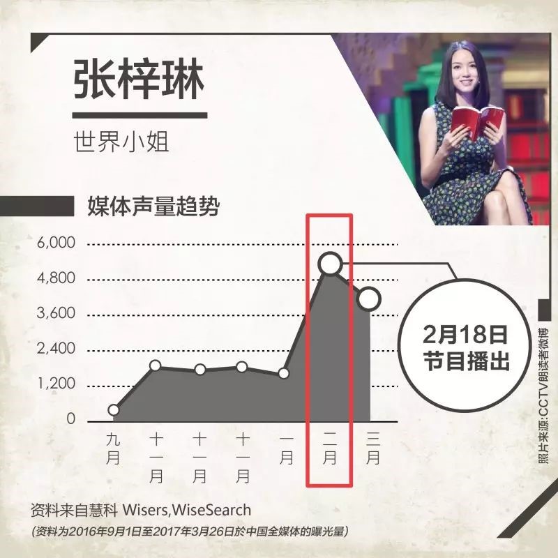 再看世界小姐张梓琳,因为职业原因,一直备受媒体关注,在《朗读者》中,张梓琳分享了自己人生中两次最美丽的遇见,十年前,一个美丽的意外,自己获得了世界小姐总冠军。这是最美的开始,也是所有美好的起点。十年后,她遇见了自己新的角色:一位母亲。她温暖、幸福的讲述让观众的心都融化了,节目播出后(2月18),她在媒体中的传播热度达到顶峰。