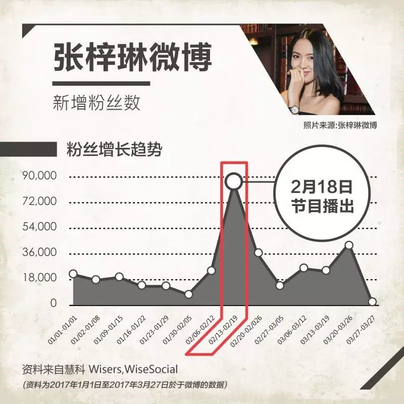 此外,张梓琳的微博在节目热播前后,粉丝增量也创造了一个小高潮。