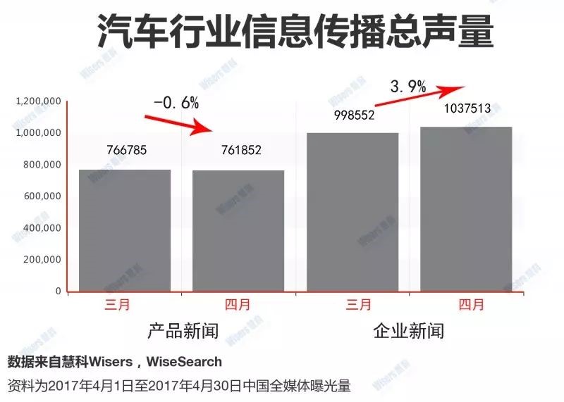 2017年4月,慧科全媒体大数据平台共监测到汽车行业传播信息1799365篇,较上月环比上升1.9%。其中,企业新闻1037513篇,环比上升3.9%;产品新闻761852篇,环比下降0.6% 。