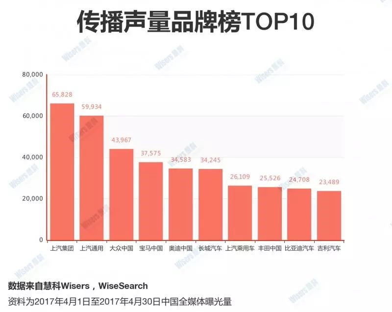 上汽集团以65828篇的传播声量,位列企业信息整体传播声量第一位。上汽通用、大众中国则分列第二、第三位。
