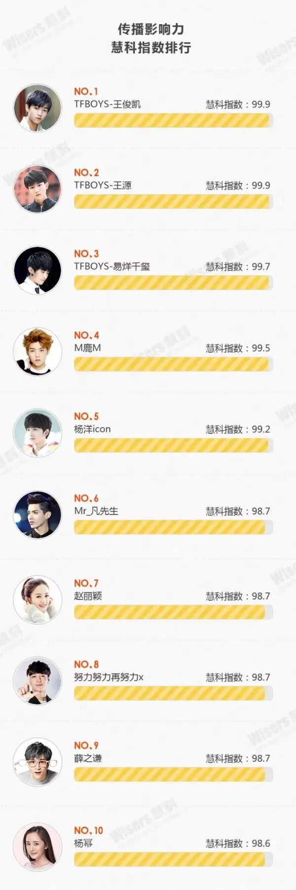 TFBOYS王俊凯、王源、易烊千玺占据榜单前三,鹿晗、杨洋、吴亦凡、赵丽颖、张艺兴、薛之谦、杨幂占据第4到10位。