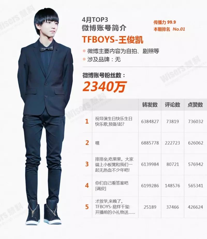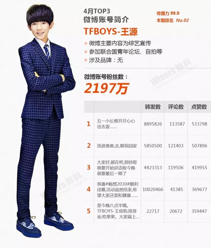 榜单中,一个非常醒目的变化是TFBOYS三只00年前后的小鲜肉已占据榜单前三。而在3月份我们的分析图文中,第一名还是1990年生的鹿晗童鞋。