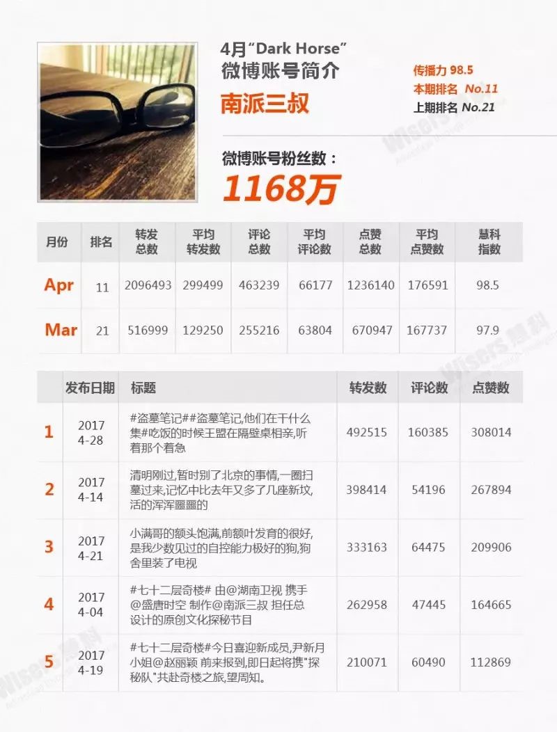 南派三叔四月排名从三月的第21名一跃升到第11名,位列非娱乐明星名人NO.1,不仅仅是突进的“黑马”,更是此次榜单最具传播实力的非明星账号。