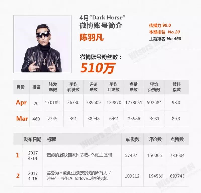 此外在其他非明星账号中,自媒体账号“微博搞笑排行榜”和“papi酱”均排名在30名以内,四月传播影响力非常优秀。
