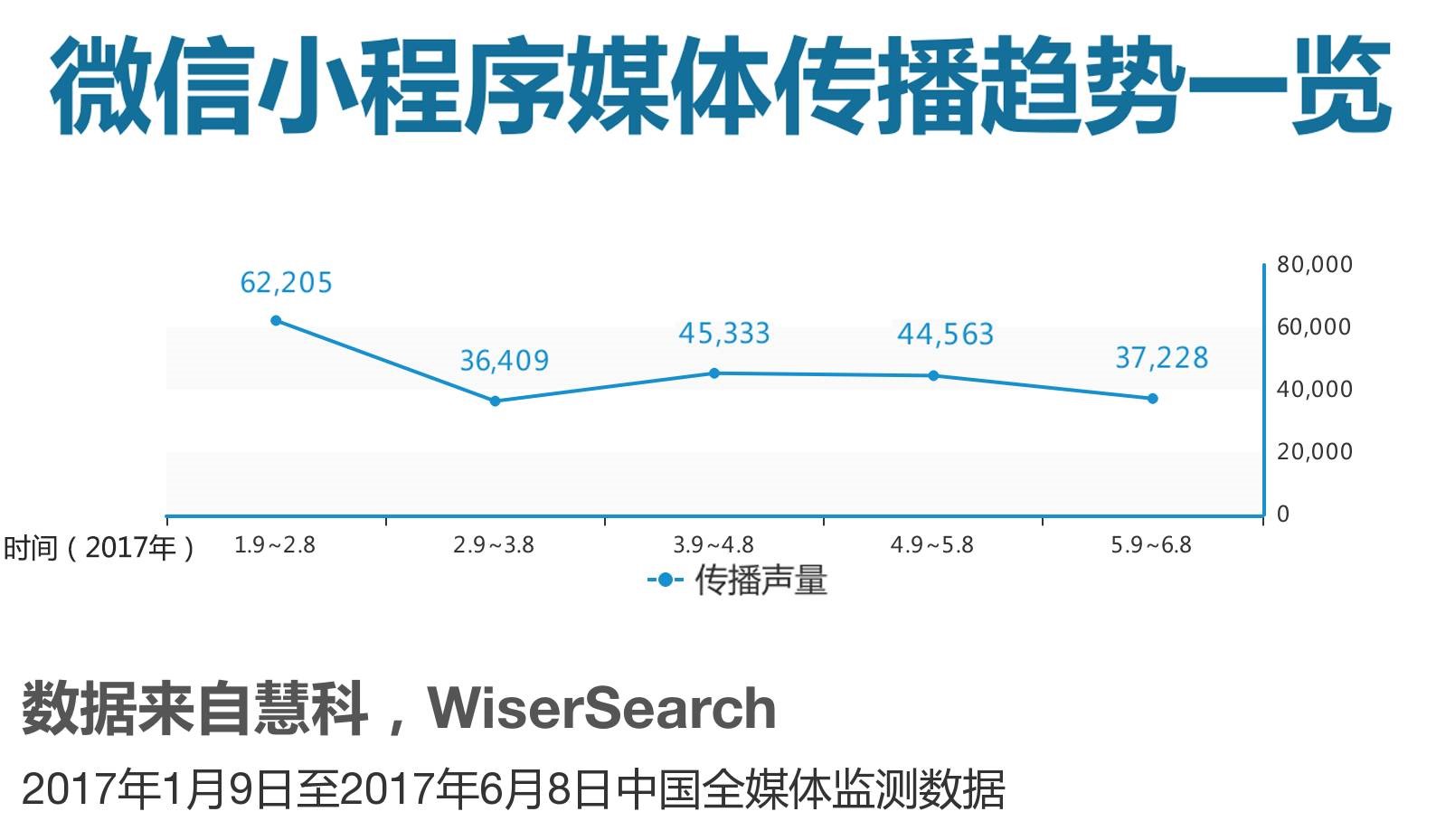 慧科大数据平台对小程序事件传播媒体关注度监测数据进行梳理,可以看到小程序“出生”之后,媒体关注度居高不下,小程序依托于微信,在张小龙的呵护下含着金钥匙出生,自然在出生之时便备受瞩目。但近半年后期的小程序更新的媒体反响,只能用“反响平平”来形容。
