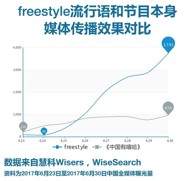 根据慧科大数据平台监测,freestyle的传播热度比起节目本身有过之而无不及:该节目媒体传播不温不火,反而是该流行语freestyle一路蹿升,监测期间一直热度不减。