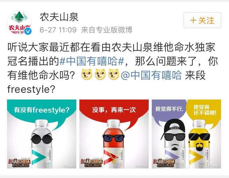 在热点营销方面贴合最紧密的是独家冠名商农夫山泉维他命水。6月26日,农夫山泉微信公众号推出“听说维他命水冠名了一档有frestyle的节目?”为标题的图文;紧接着在27日,农夫山泉官微推出一组画风清奇的营销海报,颇具看点。