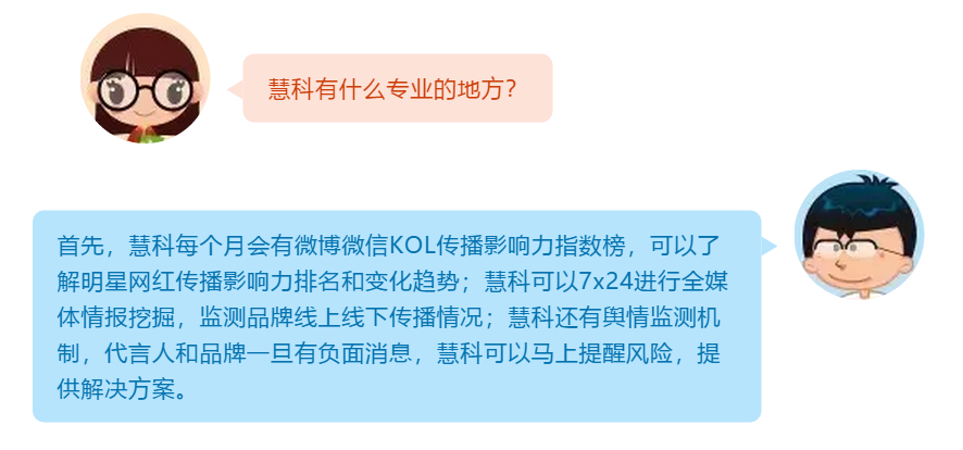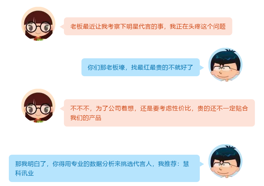 找代言人需要经过科学的前期调研,精准的策划投入以及实时的效果监测。代言人要怎么找?最基础的三个考量因素——行业知名度、产品契合度以及带来的潜在风险,这些慧科都可以帮你解决。