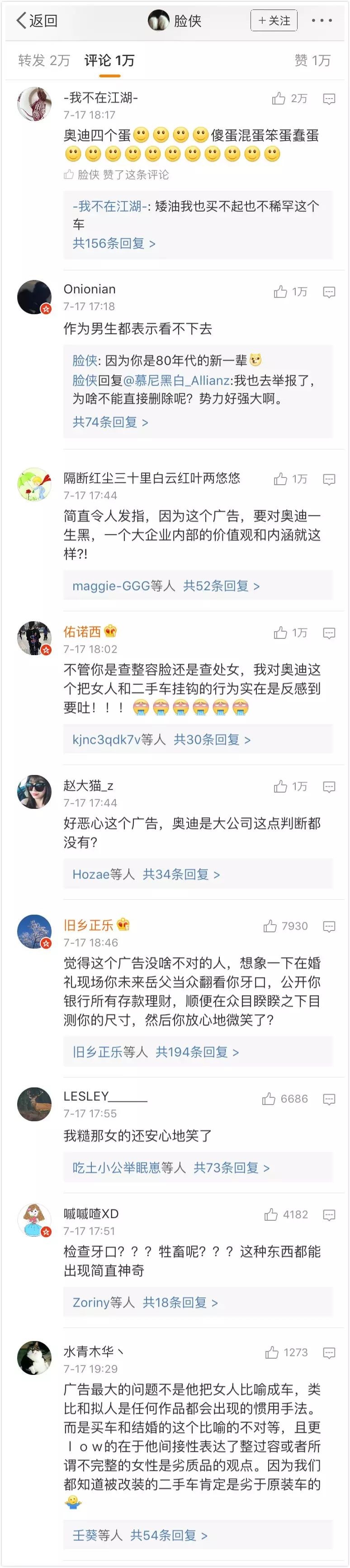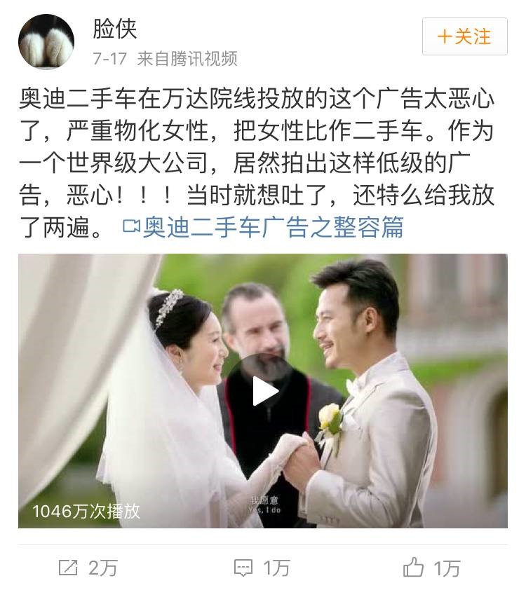 7月17日,用户“脸侠”微博曝光该广告。称:“奥迪二手车在万达院线投放的这个广告太恶心了,严重物化女性,把女性比作二手车。作为一个世界级大公司,居然拍出这样低级的广告,恶心!!!”