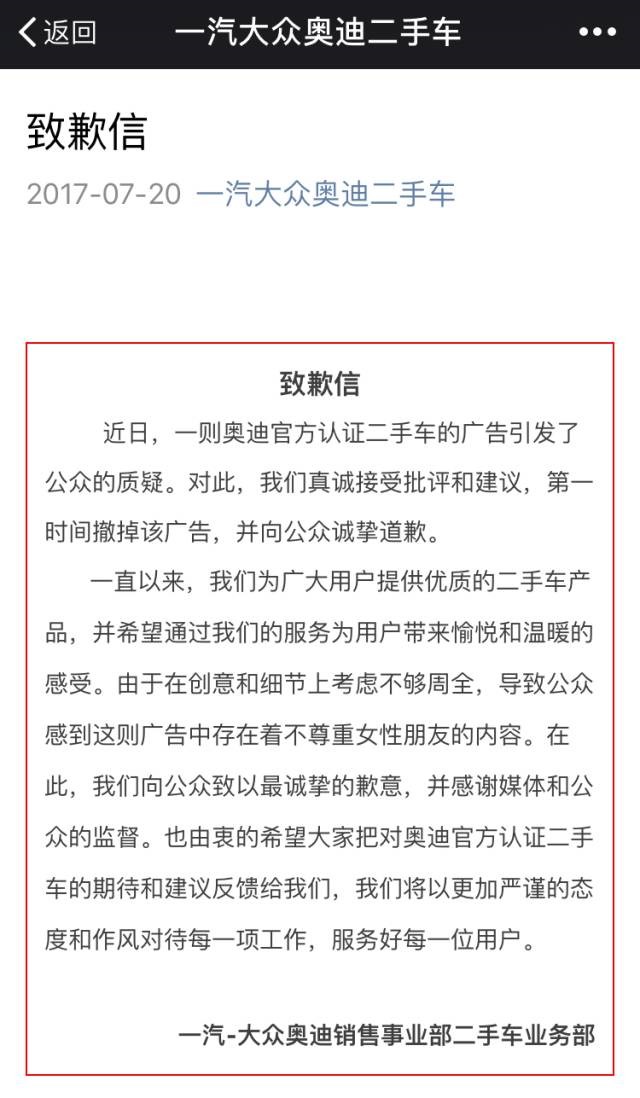今日(7月20日)“一汽大众奥迪二手车”官方公众号在微博上发表致歉信,但看起来时机似乎有点晚了(舆情已发酵4天)。