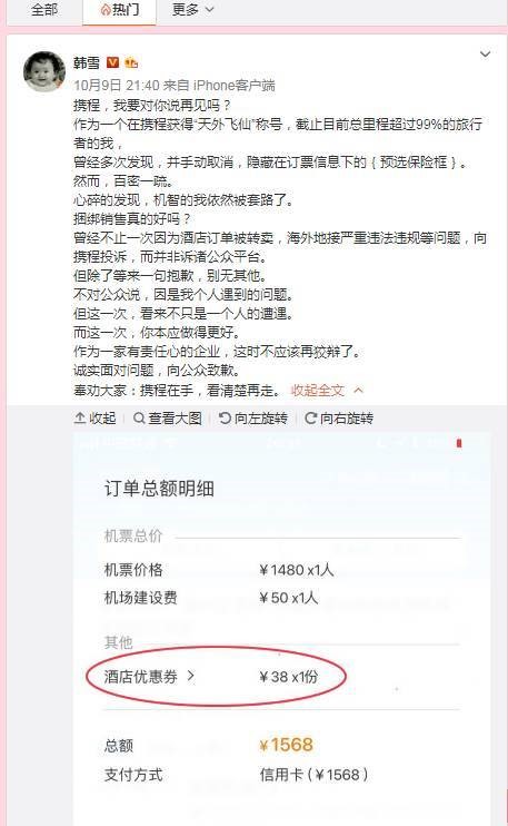 韩雪,国内知名女演员,舆论号召力强大。10月9日,韩雪发言表示携程“捆绑消费”: