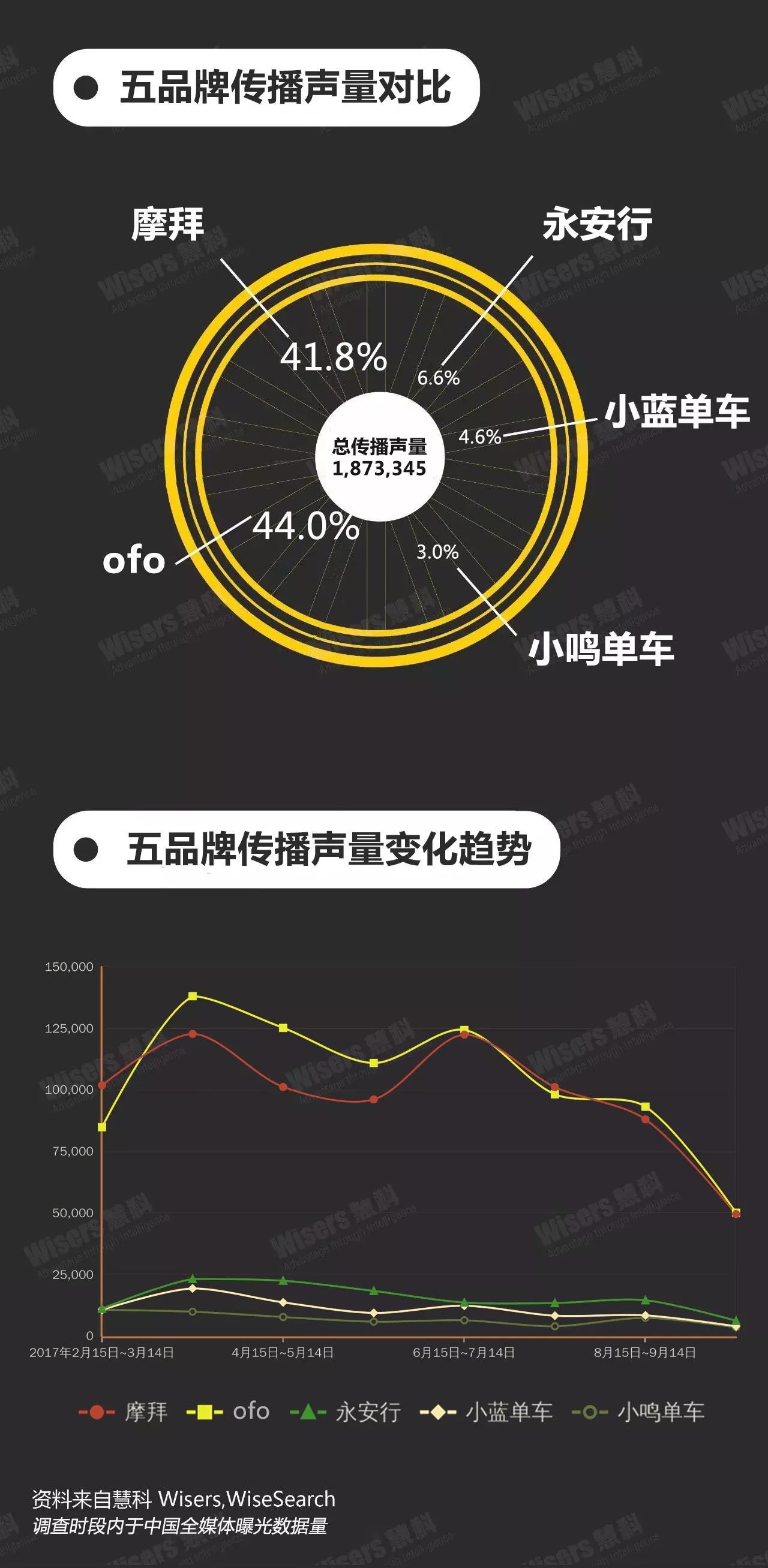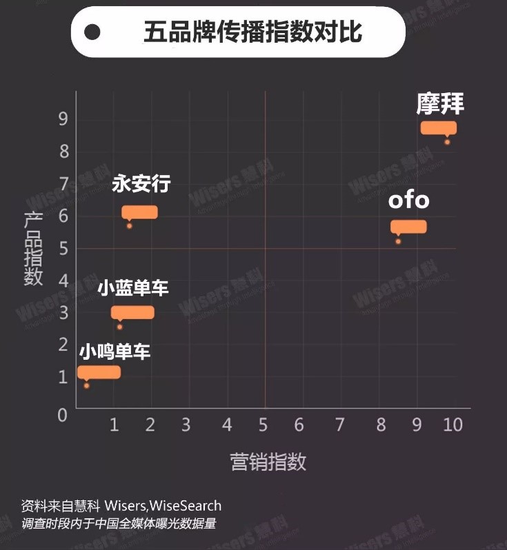 产品指数和营销指数两个维度上,摩拜和ofo双双占优。摩拜、ofo传播内容以“融资”“节日促销”“区域促销”“智能车型”为主,同时摩拜与ofo两者“相爱相杀”,在营销推广、产品区域投放等环节形成强烈的对比,提升了用户对两品牌的印象,塑造了共享单车市场两家独大的市场地位。