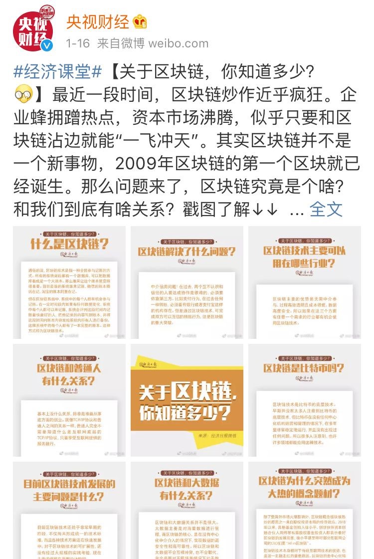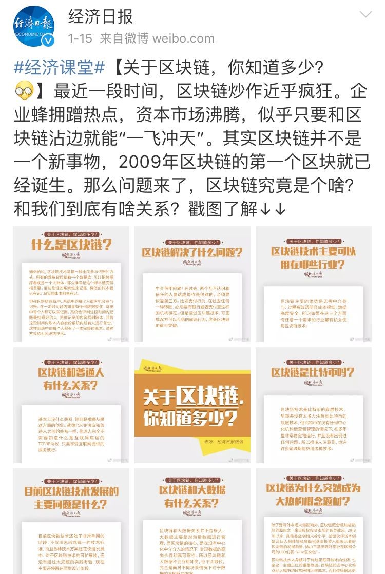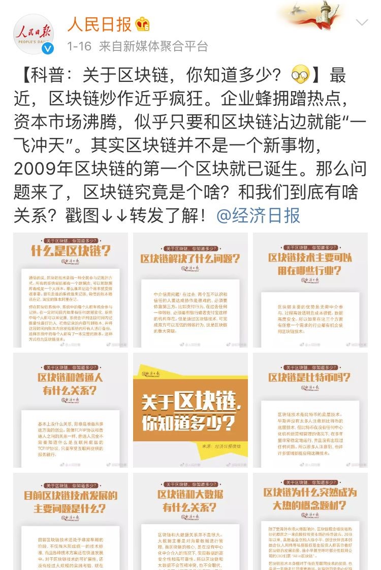 另一方面,近日中央直属党报《经济日报》精心制作了“区块链”的科普图文并发布,然后“人民日报”“央视财经”等高级别官媒均进行了转发。是何用意呢?
