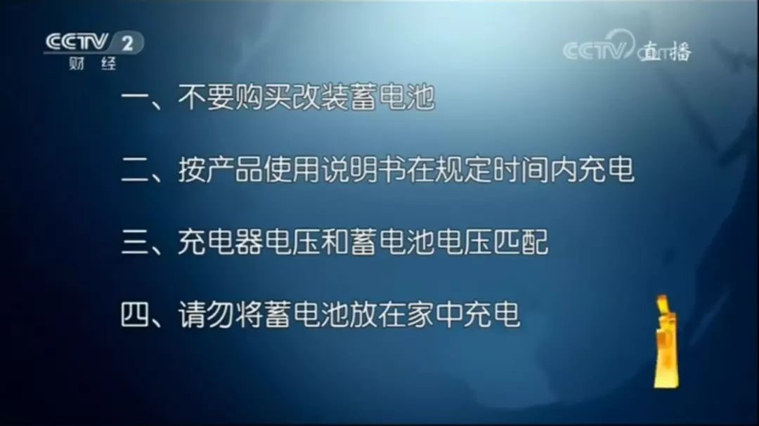 晚会报道,近年来,国内由于电动自行车引发了多起火灾事故,这其中80%的火灾都是电动自行车充电时引发的事故。电池过载充电,容易发生爆炸,引燃电动车的塑料部件,释放出大量有毒烟气,导致人员和财产损失。央视给出如下警示: