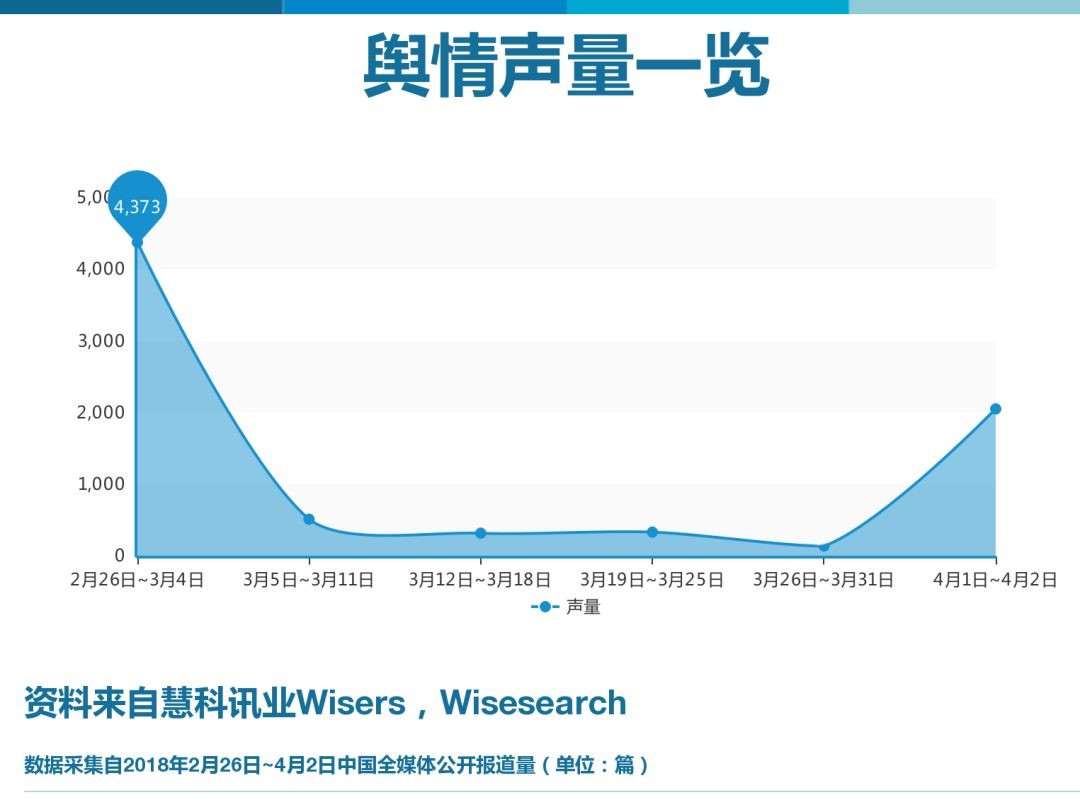 根据慧科讯业AI大数据平台媒体监测显示,自2018年2月26日起至4月2日,有关该传闻的新闻报道共有7628篇,在首周(3月4日前)的新闻报道声量最高,为4373篇,媒体主要内容为对该事件真实性的猜测与事件走向的分析。