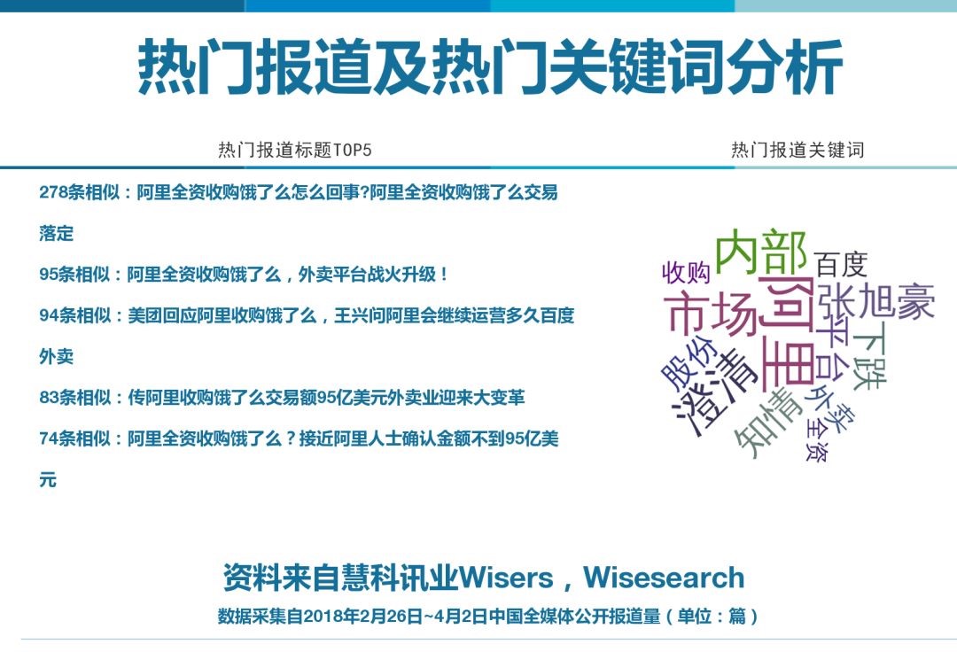 【摘要】近期,互联网收购大潮再起。其中少不了“AT大战”的味道,互联网行业格局再生变动。本期慧科讯业AI大数据媒体监测时间,慧科选取“阿里全资收购饿了么”事件为代表进行大数据分析,来分析互联网各行业巨头格局变化。相关信息为您的经营管理提供参考。