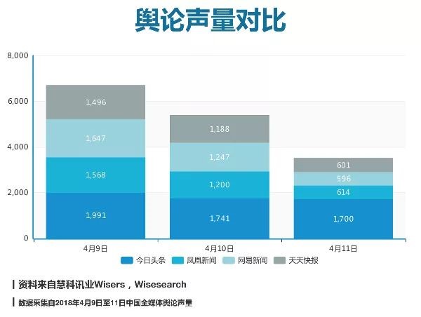 根据慧科讯业全媒体大数据平台的舆情监测显示,受4月9日的“勒令下架”影响,4月9日~11日,网站、论坛、社交媒体等平台有关今日头条的舆情声量达5432篇;其次波及的是网易新闻,相关舆情声量为3489篇;涉及凤凰新闻相关舆论声量为3382篇,涉及天天快报相关舆论声量为3285篇。以下为对比数据: