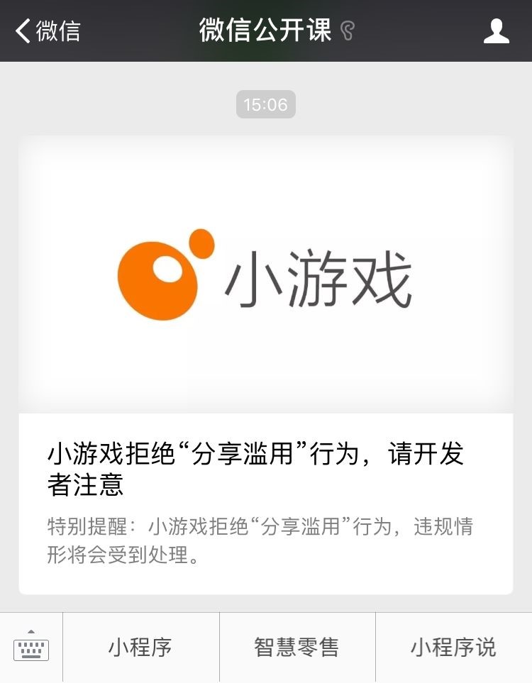 很快,微信官方对于小游戏的“分享续命”行为对开发者进行警告,并于今天正式发出禁止“分享滥用”的声明以及用户投诉渠道。