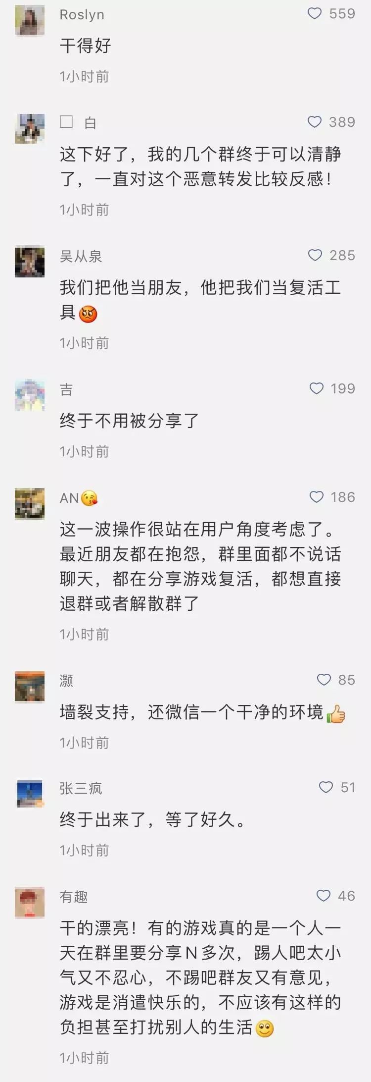 目前,微信小游戏中均已去掉“分享才能继续”的提示,转而换成了“观看广告”的复活模式,微信群中烦扰的小游戏分享链接已经正式被清理。