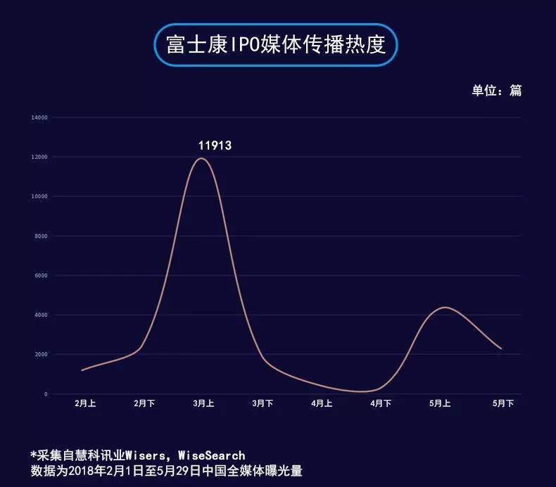 舆论方面自然也备受关注,富士康的IPO成为财经投资圈热议的话题。其中在3月上旬,富士康顺利过会、拿到证监会批文的消息被媒体热议,达到舆论声量高峰。在5月14日后,富士康正式披露招股书、股票发行安排及初步询价公告的消息,再次引发媒体舆论。