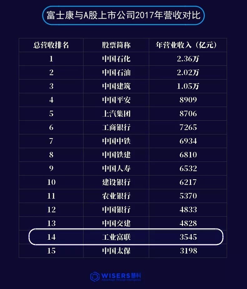 从总营收排名中往下数,不难发现除了国字头“大佬”外,富士康(工业富联)直接排在了第14名。远超绿地万科、美的苏宁等龙头非国有控股企业,更别说后面的BAT了。可见富士康规模是多么庞大!