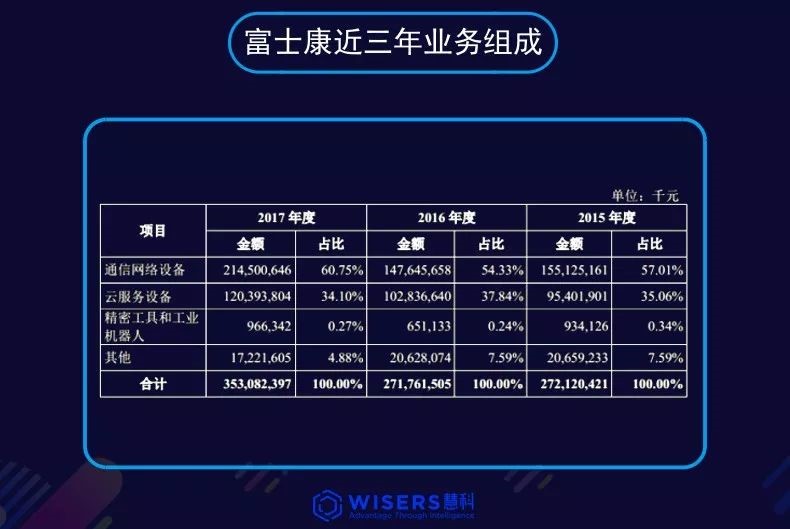 营收构成中,通信网络设备(包括手机制造)是富士康的主要收入来源,由其苹果代工厂的地位就可看出;精工与工业机器人收入虽只占0.27%,但9.66亿的营收在机器人行业中已是王者。