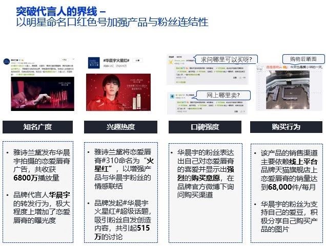 今年4月8日,微博话题#华晨宇火星红#成为阅读量4.2亿,讨论515万的超级热门话题。而这一话题让某品牌口红实现了1800万粉丝曝光,持续的热度下产品销售情况也十分可观。