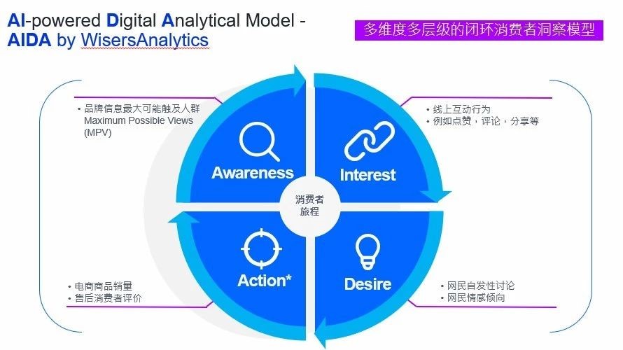 WisersAnalytics专有的AIDA(AI-powered Digital Analytical)分析模型以消费者旅程为出发点,根据用户对品牌的认知、兴趣、口碑与行为进行精准的追踪。AIDA能够帮助品牌量化目标群体、品牌互动、购买意愿、情感舆论与实际销售等营销概念, 从而提供深度见解。