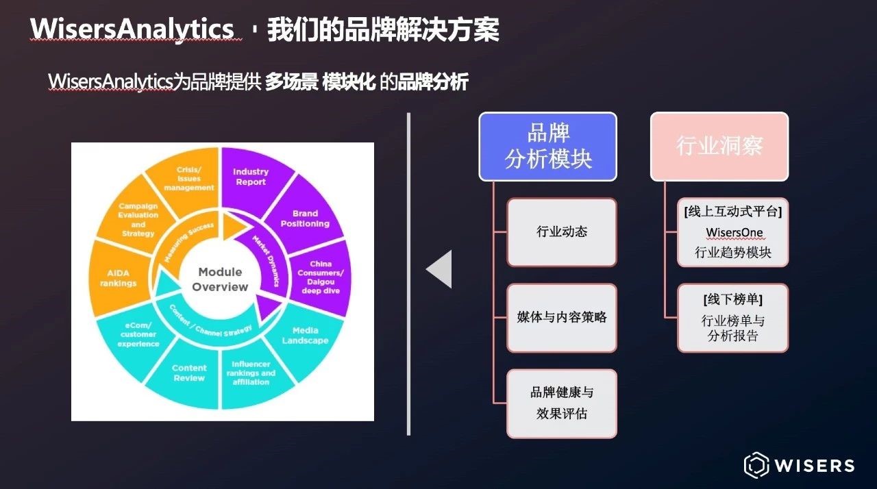 WisersAnalytics可提供多种分析产品,包括从行业报告、最佳案例分享、消费者洞察等标准化模块,到为解决客户商业问题而量身定制的咨询服务;从市场动态、媒体投放、内容策略、以及效果衡量上进行深度剖析挖掘洞察,为品牌的商业表现带来全方位正面影响。