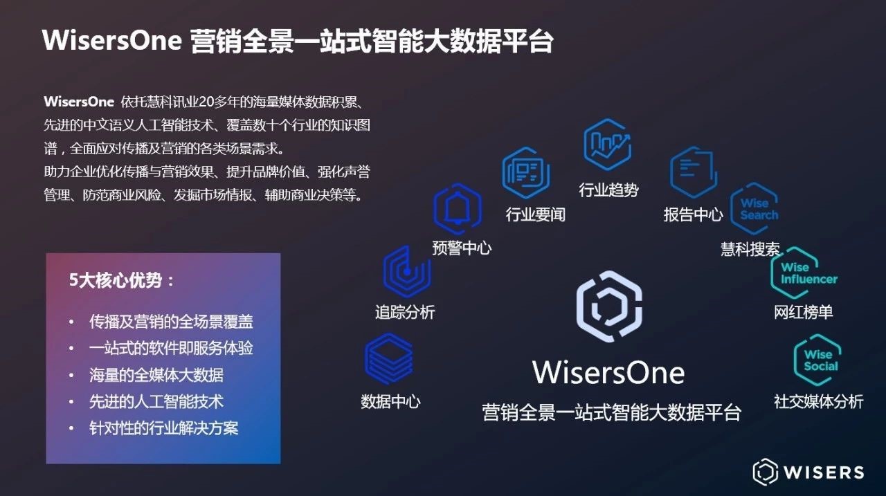 【摘要】随着人工智能时代的来临,AI技术在各个领域都逐渐显露出它的巨大能量,作为成立20年全球领先的中文媒体大数据智能商业情报提供商,慧科讯业(Wisers)顺势而为。通过慧科 AI 实验室领先的中文AI技术赋能其今年升级的营销全景智能大数据平台WisersOne,在舆情监控、负面预警、市场研究、消费者洞察、数字营销、品牌管理及商机挖掘等方面助力企业更好地决策。