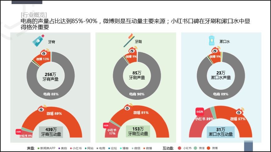 《报告》显示,在2018年上半年,微博从代言人到明星同款,全方位针对年轻受众群,在提高品牌曝光度方面具有绝对优势, 对行业互动量的贡献超过80%。微信由时尚美妆类自媒体传输口腔护理中的爱美概念,小红书评测干货得到官方美妆账号转载,由此建立产品口碑提高购买欲望。而在漱口水这个品类中,小红书以不到1%的声量,贡献了整个品类接近4成的互动量,凸显小红书口碑效应的重要性。