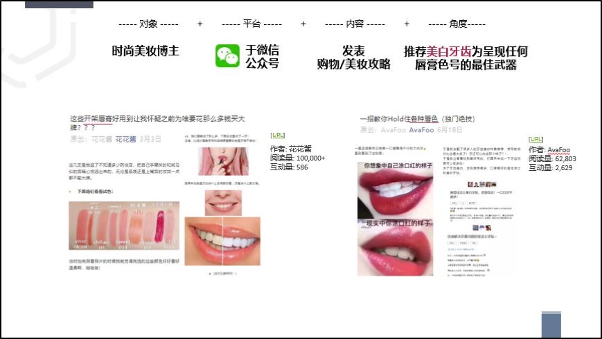 微信上的宣传则以软性广告为主,品牌主打女性消费者,抓住读者对于美妆类话题的兴趣,进行跨界营销。品牌邀请美妆博主以“唇膏”类话题作为微信标题,吸引读者点开,再将牙齿美白后的唇膏显白效果与其他热门色号做对比,向读者灌输“牙齿美白,擦什么唇膏都显白”的概念,将美白牙齿融为日常完美妆容的一个重要环节。