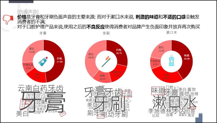 由此可见,如果要迎合消费者习惯,需要将视觉、味觉、功效等期望叠加,设计最佳口腔护理组合,以提升整体的满意度。而那些性价比过低、美白效果不理想、以及使用后不良反应引发的消费者负面评价会大大降低再次购买的意愿。