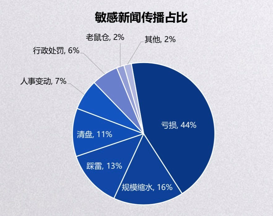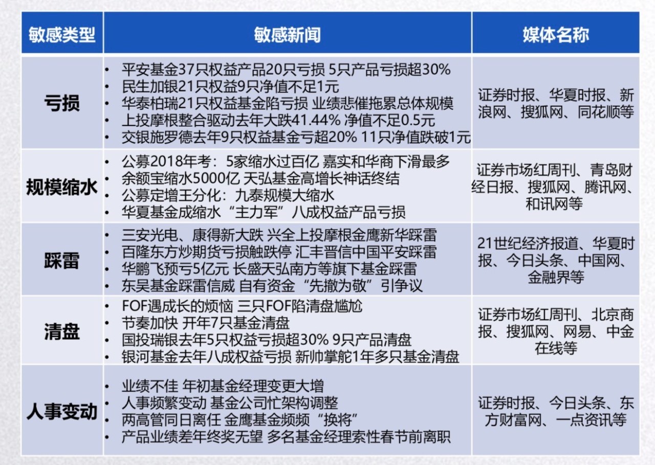 新年伊始,基金行业负面大幅攀升,引起媒体关注的行业敏感主要集中在债基踩雷、定增业务缩水、基金子公司艰难转型、基金业二八格局、FOF业绩规模双降等方面,其中,《证券市场红周刊》《投资快报》新浪网等媒体,对敏感话题关注度较高。