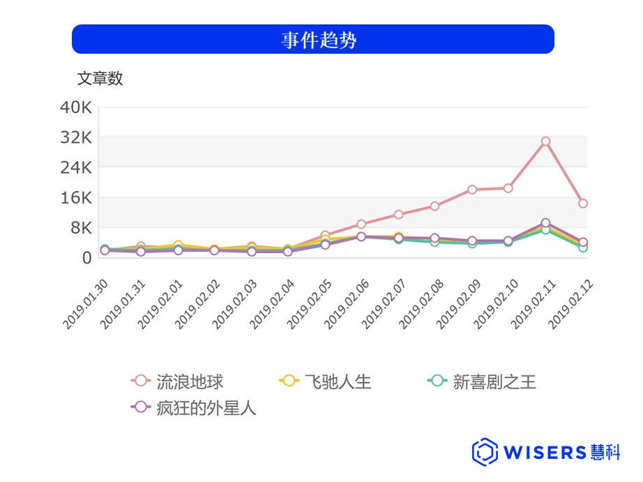 映前,今年春节档的喜剧三巨头被寄予厚望,三部影片均是知名导演+喜剧大咖的“稳赢”配置,“宁浩+沈腾+黄渤”领衔《疯狂的外星人》,“韩寒+沈腾”主扛《飞驰人生》,“周星驰+王宝强”押宝《新喜剧之王》。强强联合,使其均呈现出上佳的卖相。据慧科讯业AI大数据媒体监测平台显示,自年前进入春节档宣传期,《飞驰人生》在声量方面持续以微弱优势领跑,却仅维持至2月4日。