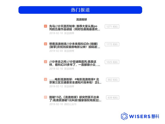分析各片的媒介布局,我们可以清晰的看到,哪些影片是真正的观众的选择。作为今年春节档唯一一部开启提前点映的电影,《流浪地球》在上映前就收获众多口碑推荐,热门报道top5中,4篇来自新浪微博,1篇来自微信公众号,自媒体传播属性明显。