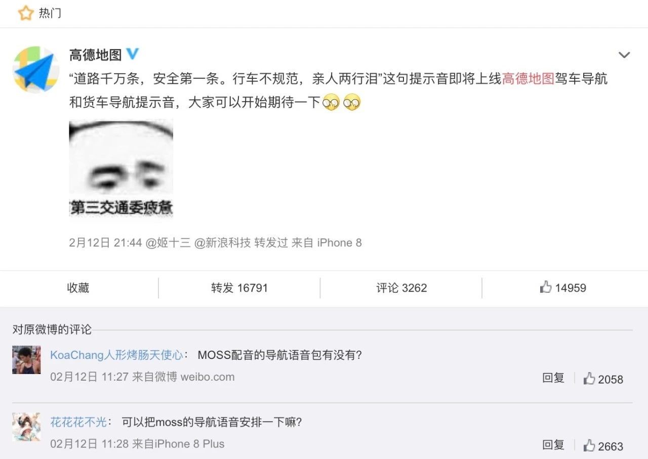 2月12日,高德地图宣布《流浪地球》的台词:“道路千万条,安全第一条。行车不规范,亲人两行泪。”即将上线高德地图驾车导航和货车导航提示音,一经发布,就获得了网友的高密度转发和评论互动,高德地图借电影东风喜提新年第一波借势营销。
